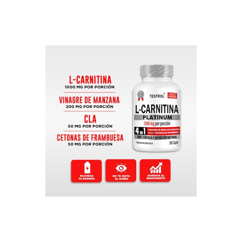 Testrol L-Carnitina Platinum 1300 mg Con Vinagre de Manzana, CLA y Cetonas de Frambuesa Apoyo Metablico para Hombres y Mujeres 90 Cpsulas