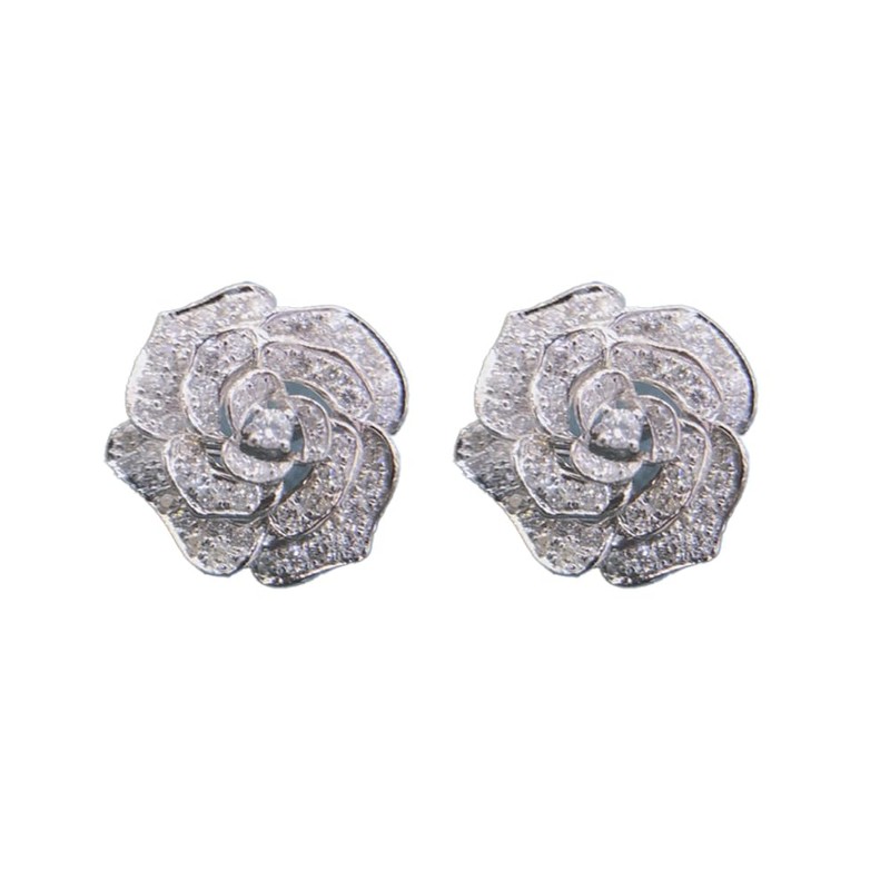 Tesuivra Lightweight Tiny Ancient Hollow Camellia Cubic Zirconia White Gold Plated Stud Earrings for Valentine's Day Gift
