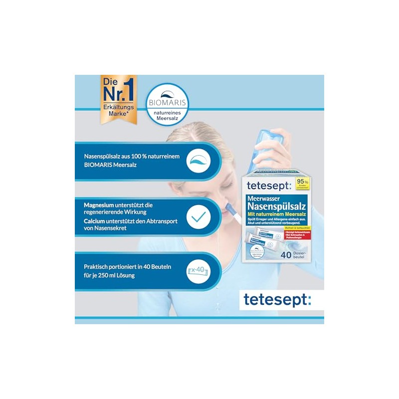 - Lieferumfang: tetesept Meerwasser Nasenspülsalz, 40 Dosierbeutel, Medizinprodukt – in Kombination mit der tetesept Nasendusche als Nasenreiniger bei Erkältungen, trockener Nase und zur Nasenschleimhautpflege.