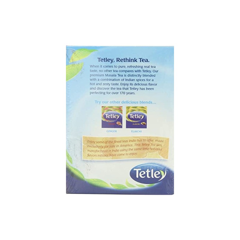 PRODUCT INFORMATION Tetley's premium tea is now selected and blended with Masala flavor, creating a truly enjoyable cup of tea. Tetley's famous round tea bag has 2000 perforations to allow the full-bodied flavor to flow through. It is also a natural source of antioxidants. So go ahead and enjoy a superior cup of masala tea and discover the heavently taste that Tetley has to offer. PRODUCT SPECIFICATIONS Net Wt. 5.08oz (144g) - 72 Tea BagsProduct of EnglandPackaging: BoxProduct Type: Teas Ingredients:Black Tea, Natural Flavors.