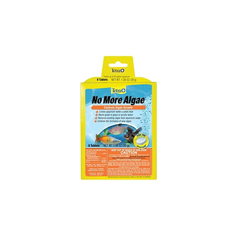 For 50 year, fishkeeping enthusiasts have looked to the Tetra name for products and solutions that add ease and beauty to their home. Whether you're an experienced hobbyist or just starting out, Tetra has everything you need–-from a large variety of quality fish food and innovative equipment to test kits and decor. Tetra No More Algae Tablets use the fizz tab system to release into your aquarium water. Tetra No More Algae Tablets leaves aquarium water crystal clear, and work great in glass or acrylic aquariums. Tetra No More Algae Tablets remove existing algae from aquarium water and work to control the formation of new algae. This pack contains 8 tablets and treats up to 80 gallon aquariums. Control algae growth within your aquarium environment with Tetra No More Algae Fizzing Tablets. Tetra No More Algae Tablets are not for use with live plants and not recommended for turtle tanks.