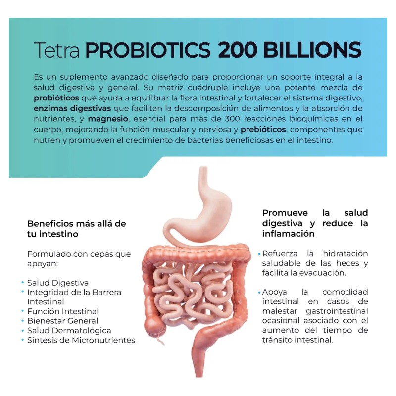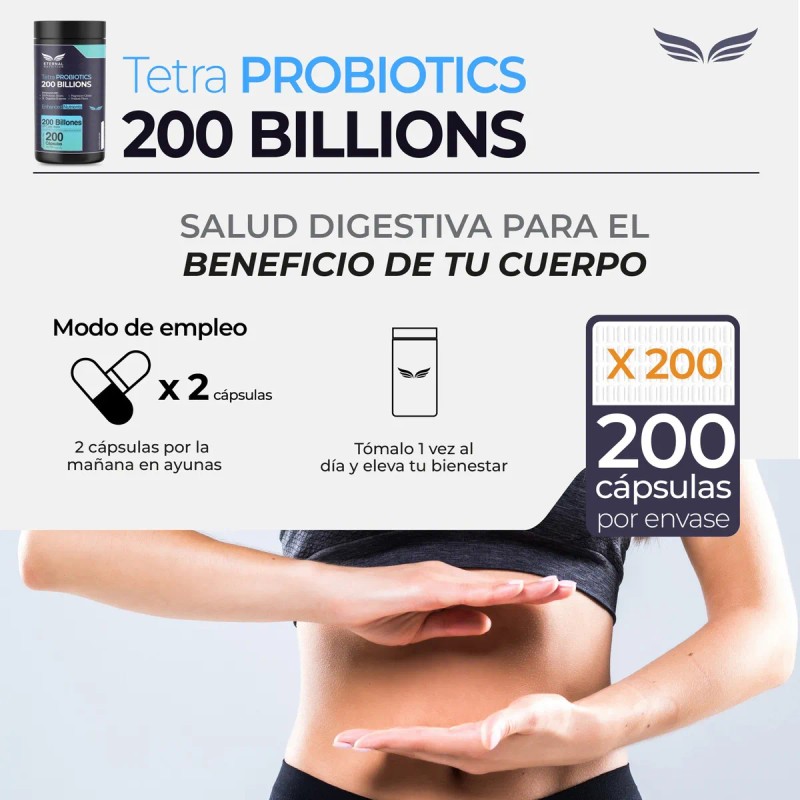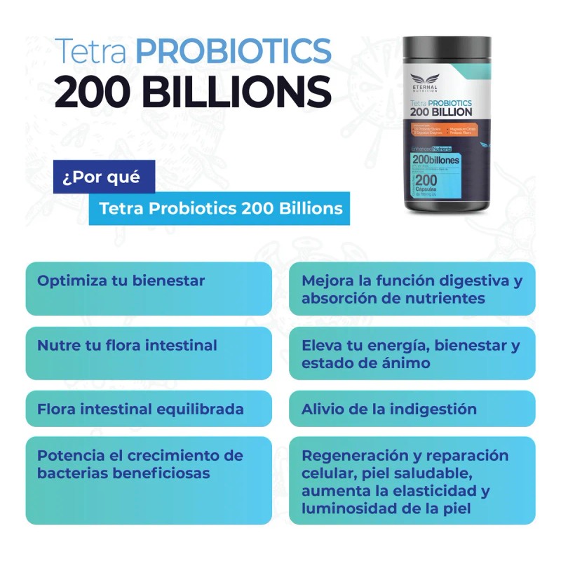 TETRA PROBIOTICS 200 BILLONES - 200 capsulas (200 BILLONES UFC por porcion), Complejo de Probioticos con Fibras Prebioticas, Enzimas Digestivas y Citrato de Magnesio by Eternal Nutrition