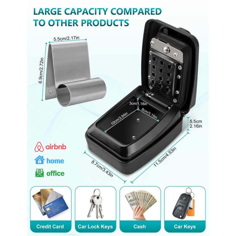 - LARGE CAPACITY: The key lockbox has a large internal space, which can hold 5-8 keys or other small objects, such as car keys, house keys, access cards, ID cards, cash, etc. Multi-scenario installation and use, storage of keys is safe and convenient