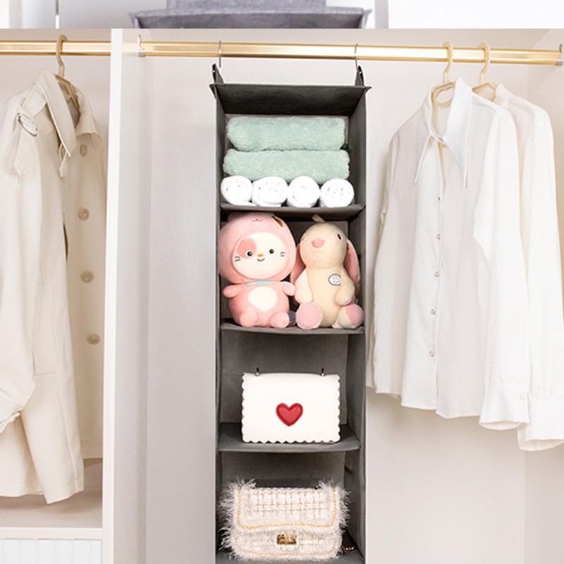- It is a hanging wardrobe storage solution with 5 compartments arranged on top of each other for clothes, bedding and other items