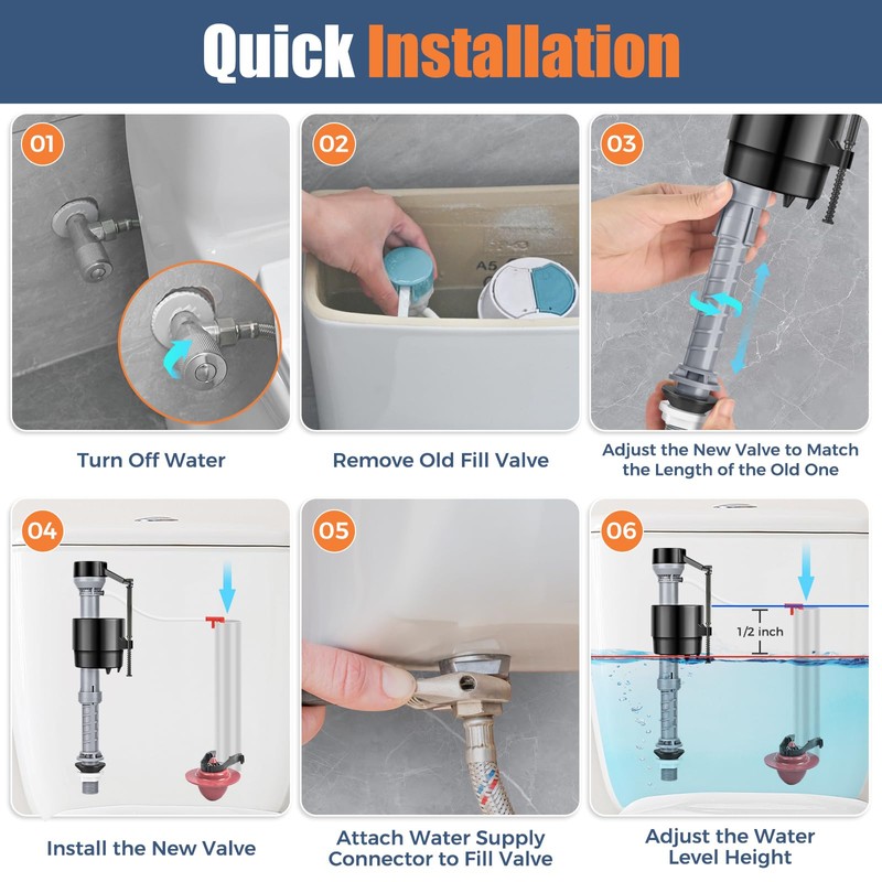 - 【Universal Compatibility】Compatible with most toilet models and brands, this toilet fill valve replacement kit features a US standard G15/16" inlet. Its height is easily adjustable from 8 to 13 inches, ensuring a perfect fit for various tank sizes