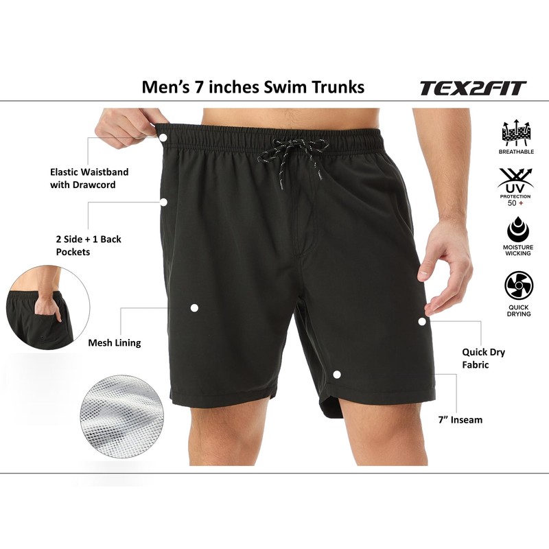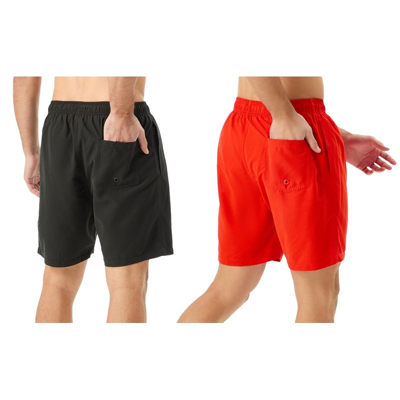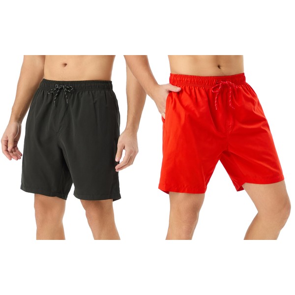 TEX2FIT Men's 7 Inch Swim Shorts with Mesh Liner, 2-Pack Classic Solid Color Swim Trunks with Pockets 7” Inseam (Black/Red, Large)