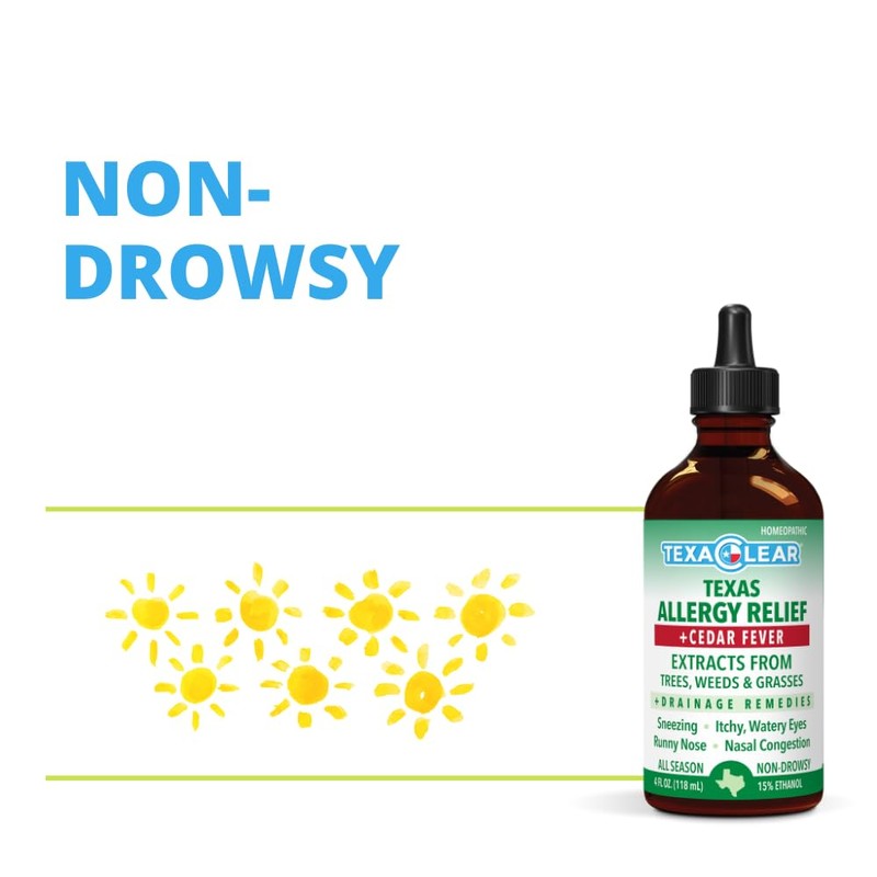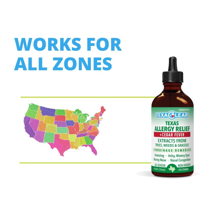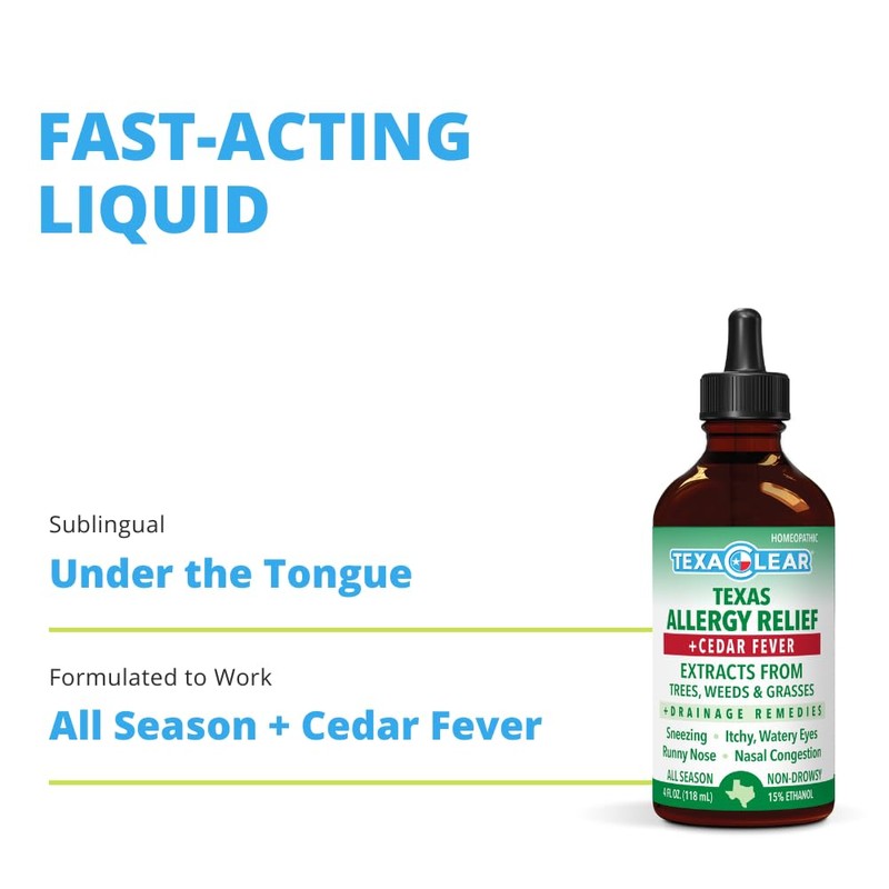 TexaClear Texas Allergy Relief + Cedar Fever drops are a effective homeopathic remedy for Texas allergy symptoms. This gentle, sublingual formula defends against the allergens that cause allergic reactions such as sneezing, itchy, watery eyes, runny nose and nasal congestion. TexaClear drops work by exposing your body to micro-doses of the long list of trees, weeds and grasses causing your symptoms.