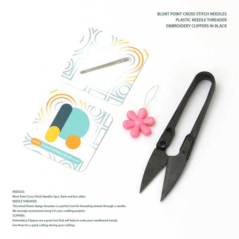 - The KIT contains: 1x 16 Count AIDA fabric in White, 1x 16 Count AIDA fabric in Beige, Set of Threads, 3x Needles, 1x Needle threader, 1x Embroidery clippers in Black, Color counted patterns printed on A3 format paper.