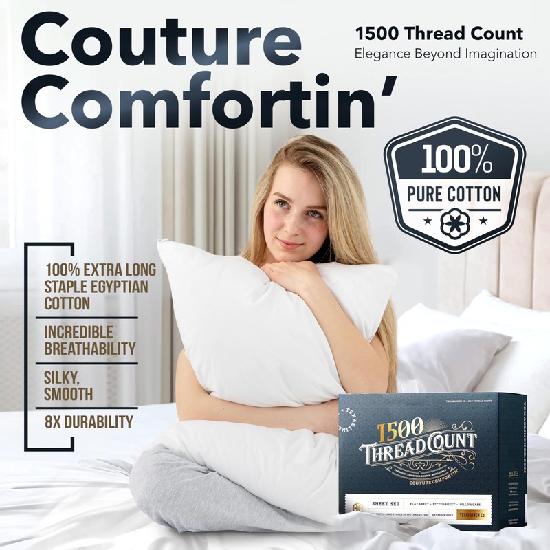 - Experience Unrivalled Luxury with Texas Linen Co.'s 1500 Thread Count Sheets King Size Set: Immerse yourself in the epitome of luxury with our 1500 Thread Count Egyptian cotton sheets king size, crafted from extra-long staple cotton for unparalleled softness and comfort. Perfect for the best sleep of the season, these high quality sheets king size keep you cool and ultra-breathable, ideal for hot sleepers prone to night sweats