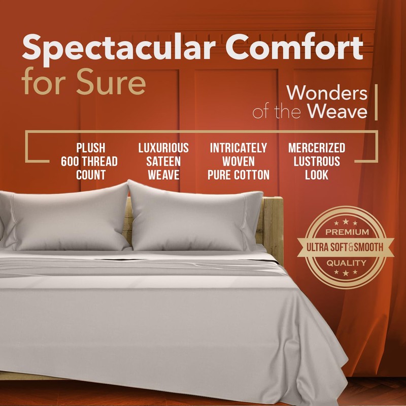 - The Softest & Comfiest 100% Egyptian Cotton Sheet Set: Made from the finest extra long staple cotton that produces softer and finer fabric, our 100% Egyptian cotton sheets california king size are unbelievably soft and cozy, like five-star hotel bedding luxury. Sateen weave makes the fabric smooth & silky. Moreover, our 600 thread count bedsheets are OEKO-TEX validated for no harmful substances