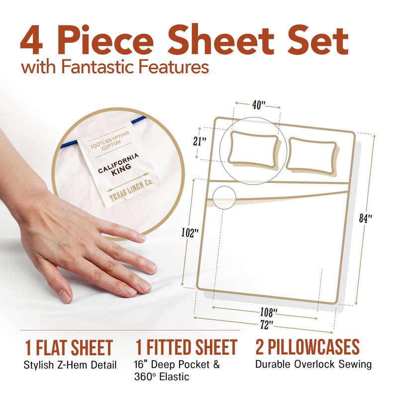 - Perfect Luxury Gift For Your Loved Ones: Our premium & high-quality Egyptian cotton california king bed sheets are a great gift for housewarming and other festive occasions. You can also pair them with a solid duvet cover, mattress topper, bed pillows, and matching pillowcases from Texas Linen Co.’s home decor collection. Try our Egyptian cotton bedding and feel the difference yourself
