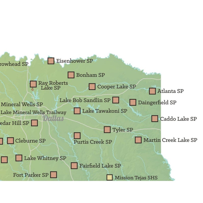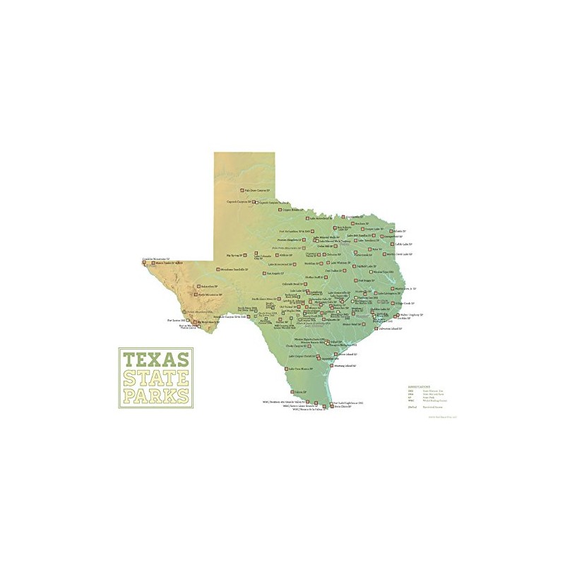 This small poster plots out the complete Texas State Parks system, which is administered by Texas Parks & Wildlife Department. Icons marking each state park unit are suitable for pins or coloring in the areas you've visited. With over 100 parks spread throughout the state, this print is sure to inspire exploration!