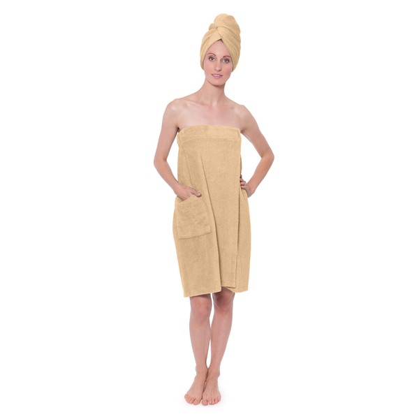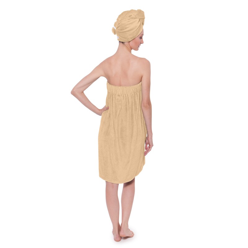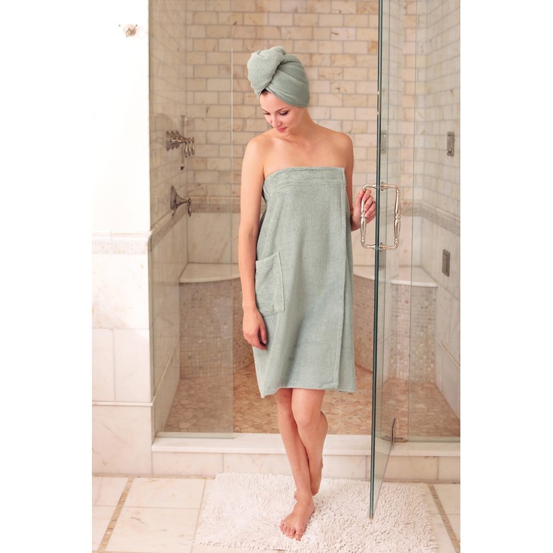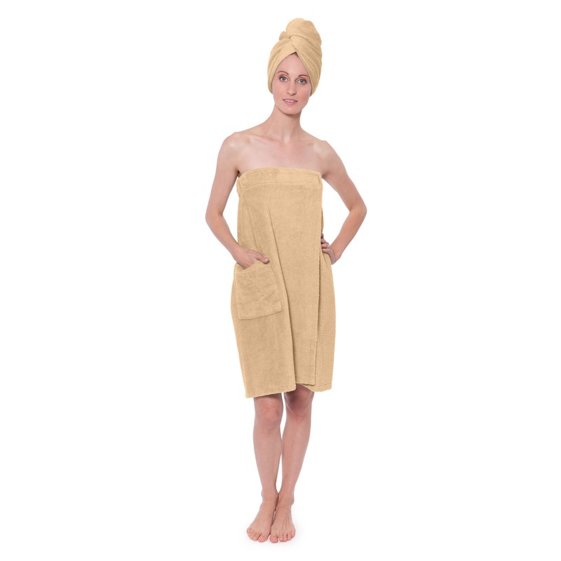 - LUXURIOUS DESIGN: This 2pc spa set includes a body wrap and matching hair wrap. The body wrap has a convenient pocket, durable elastic back and multiple snap closure. Our hair towel has a unique shape that forms to your head. Our design eliminates excess, bulky fabric making it easy to wrap and secure your towel in place with a small elastic fastener.