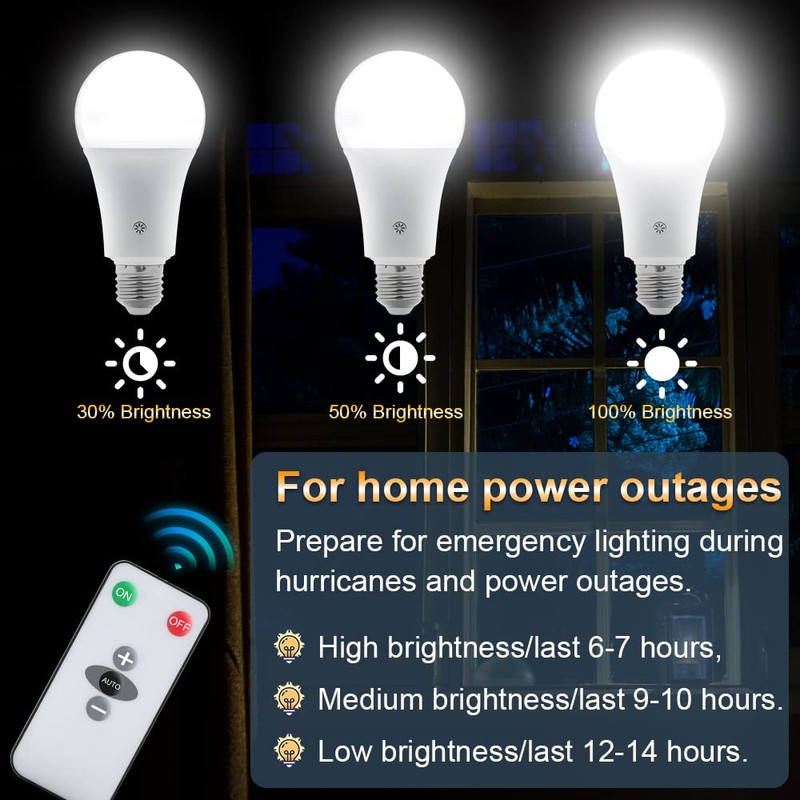 - đź’ˇLong Time Emergency - This battery powered light bulb is equipped with a 2200mAh battery backup and has three levels of brightness: high (6-7 hours of illumination), medium (9-10 hours) and low (12-14 hours). The brightness can be adjusted using the remote control or a button.