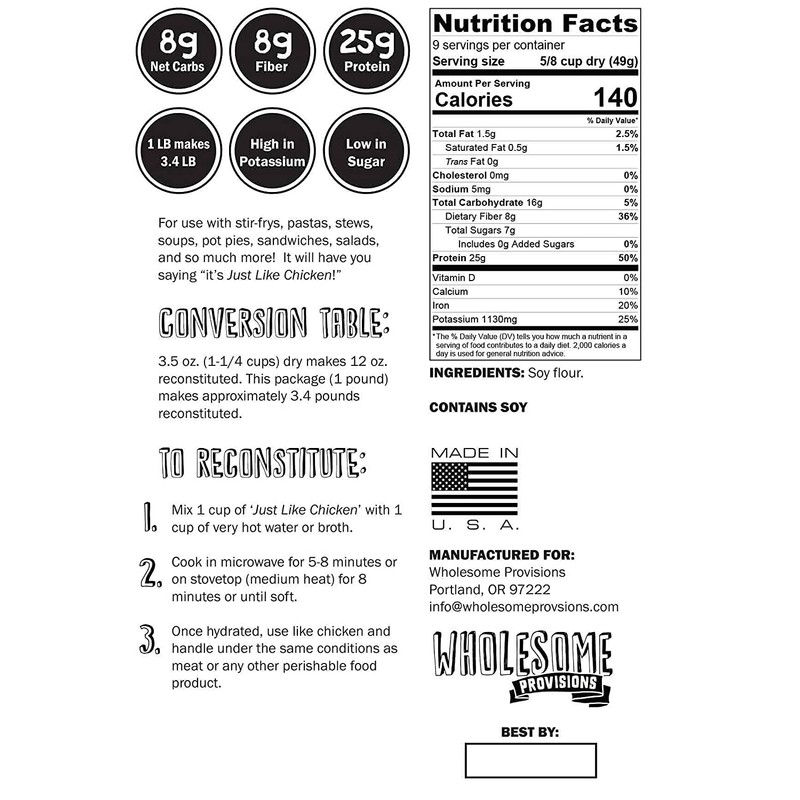 Just Like Chicken from Wholesome Provisions is 100% Vegan meat substitute/meat analogue and is made entirely in the USA. Sourced soybeans are certified #1 Graded Yellow Soybeans. Our textured vegetable protein is 100% hexane free. Just Like Chicken is quick and easy to prepare and highly versatile. It will be the star of your dishes and have you say it's "Just Like Chicken!"