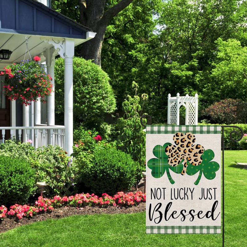 Texupday Not Lucky Just Blessed Leopard and Dots Shamrock Clovers Decoration St.Patrick's Day Double Sided Vertical Burlap Garden Flag Rustic Holiday Party Outdoor Yard Banner 12" x 18"