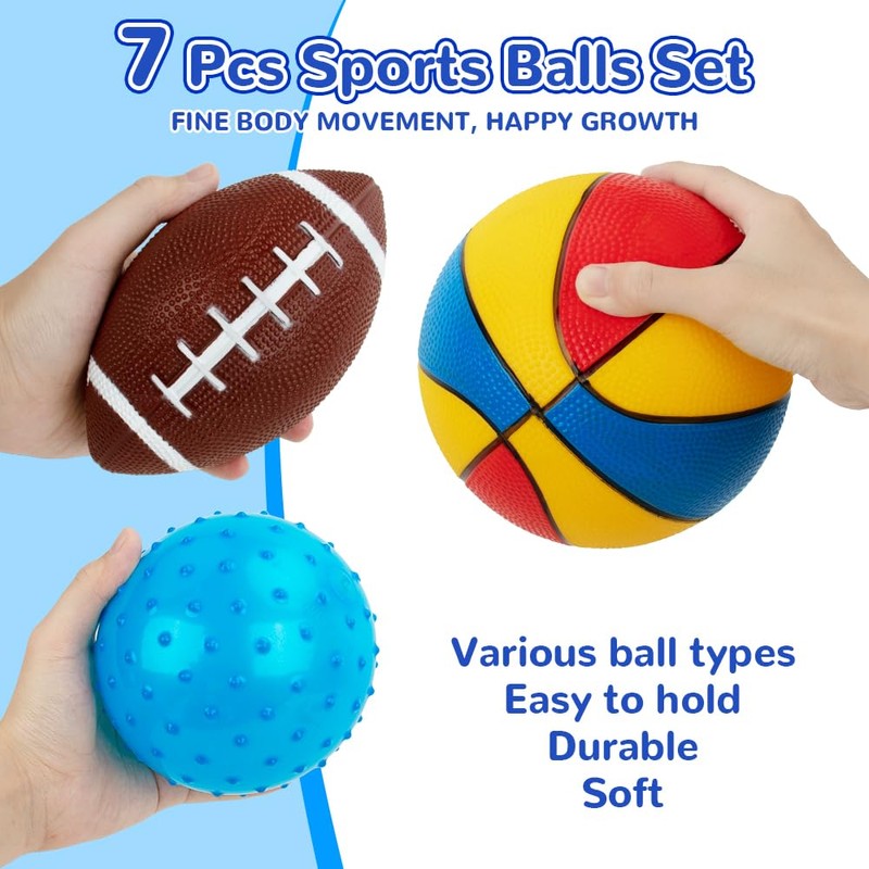- GREAT VALUE 7-PACK SPORTS BALL SETGet your little one moving with the valuable 7-pack sports ball set! Perfect for toddlers aged 1-3,these sports balls are sure to keep them active and entertained.Including 2 soccer balls,2 basketballs,1 baseball,1 Rugby and 1 bouncy ball plus complimentary air pump and mesh bag.Make playtime even more enjoyable with these fantastic ball toys.