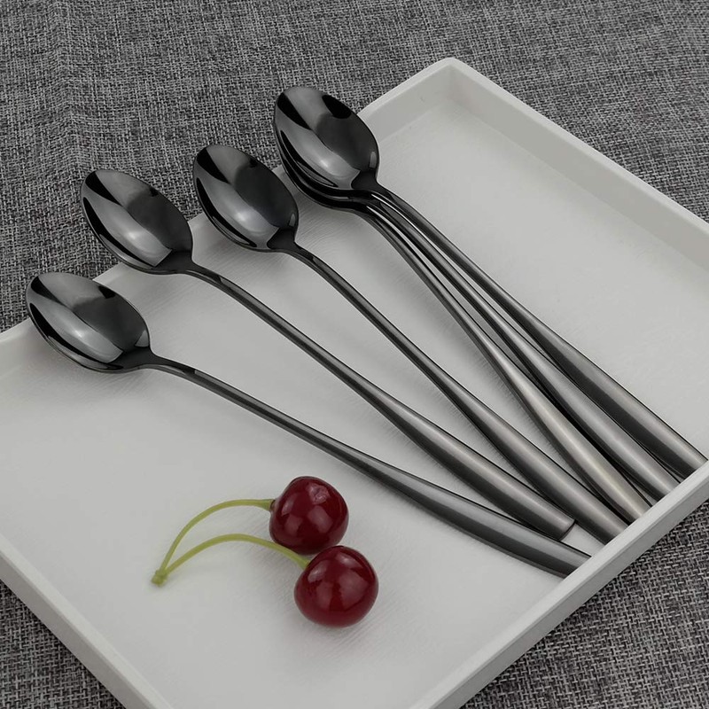 Teyyvn Cuchara de té helado de acero inoxidable negro, cuchara para agitar de mango largo, juego de 8