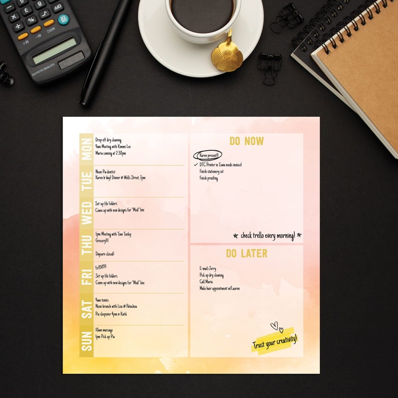 • EASY TO USE: The design of this weekly planner notepad makes planning your days effortless! Once you fill in the dates and write out your schedule you’re ready to take on the day. Additional spaces for tasks to do now or to do later are also included!