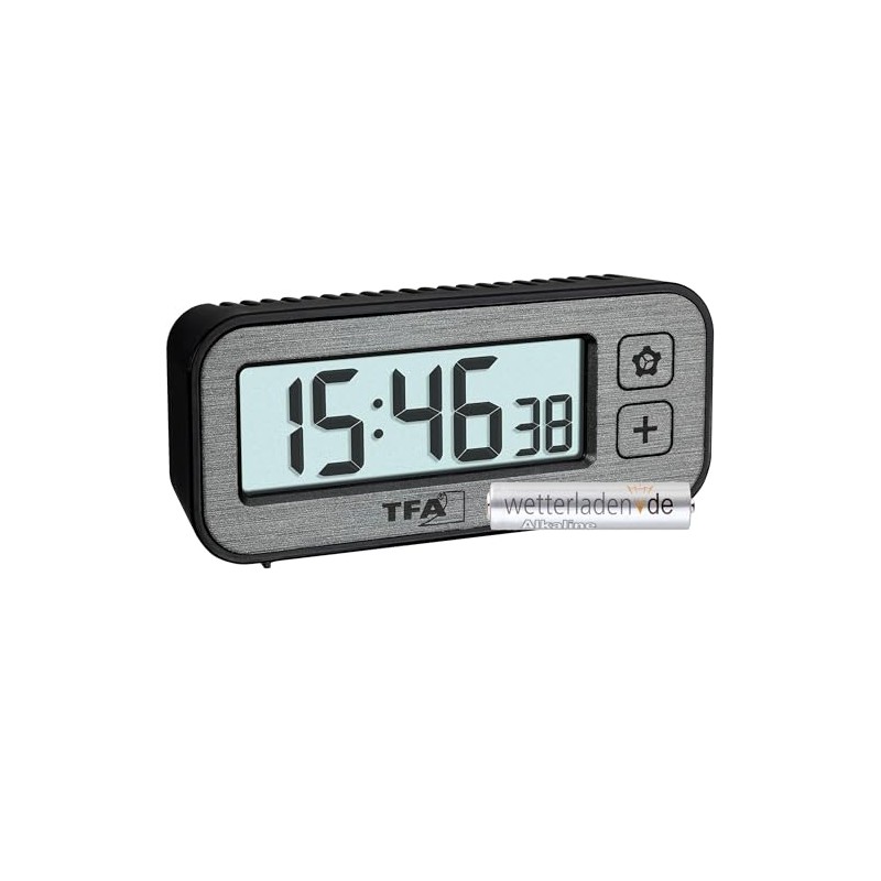 TFA Dostmann Wireless Alarm Clock Digital with Temperature and Humidity Switch, 60.2522.10, with Maximum and Lowest Values, with Alarm and Radio-Controlled Clock, Travel Alarm Clock, Small,