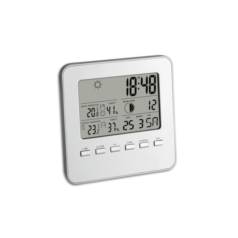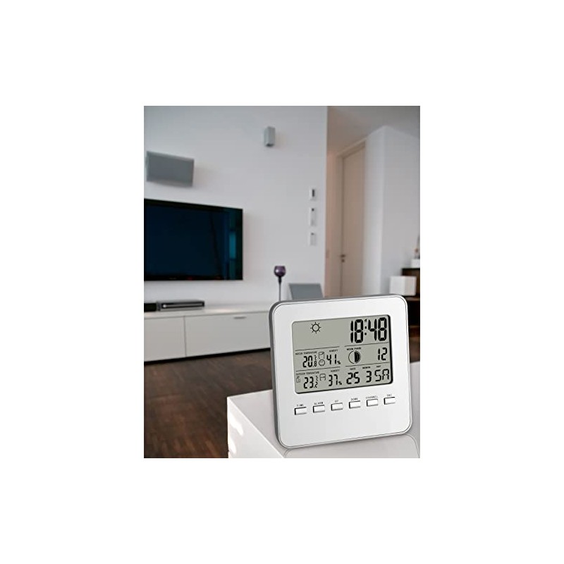 35.1098 Features: -Wireless transmission of outdoor temperature and humidity via up to 3 transmitters. -Display of indoor temperature, humidity with comfort zone, temperature tendency, weather symbol (based on change of humidity values) and lunar phase. -Time with alarm, snooze-feature and date display. -°CC/°CF switchable. -Suitable for placement in hanging or standing position. -Specifications: Measuring Range (Humidity): 20 to 95%. Generic Specifications: -Base Station: 13 cm H x 13 cm W x 2.5 cm D. -Transmitters: 9.5 cm H x 6.5 cm W x 3 cm D. Dimensions: -Product Weight: 0.4 kg. Overall Height - Top to Bottom: -13 Centimetres. Overall Width - Side to Side: -13 Centimetres. Overall Depth - Front to Back: -2.5 Centimetres. Overall Product Weight: -0.4 Kilogram.