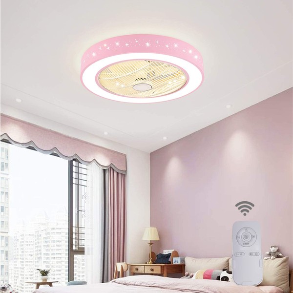 TFCFL 22" Invisible Ceiling Fan with Light, Modern Round Semi Flush Mount Chandelier Fan Drum Shaped Star Pattern with Remote Control Tri-Color 3 Speed Hidden Blades for Kids Bedroom (Pink)