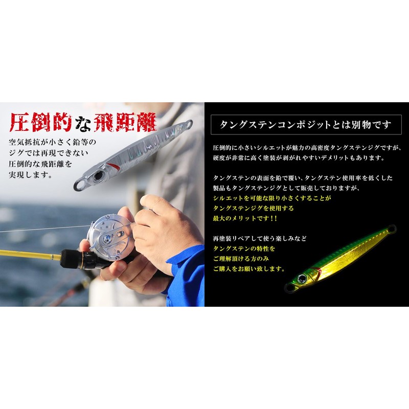 - <小魚ベイトパターンではタングステンジグしか食わない場面も> カタクチイワシ等がターゲットのマッチザベイトパターンの場合、大きなシルエットのジグに全くあたりの無い場面もあります。 必ず1つ高密度のタングステンをタックルボックスに忍ばせておくことを強くお勧めします。 <圧倒的な飛距離> 空気抵抗が小さく、鉛等のジグでは再現できない圧倒的な飛距離を実現します。