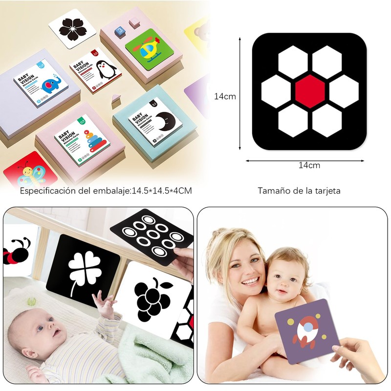 - ✅ 【4 Juegos para Diferentes Grupos de Edad】 0-3 meses: Tarjetas en blanco y negro de alto contraste para mejorar la distancia visual; 3-6 meses: Patrones en blanco y negro con acentos rojos para diferenciar la diferencia entre los cambios de color; 6-12 meses: Patrones coloridos para estimular la imaginación; 12-36 meses: Objetos específicos en diferentes colores pueden mejorar las habilidades cognitivas de su hijo.