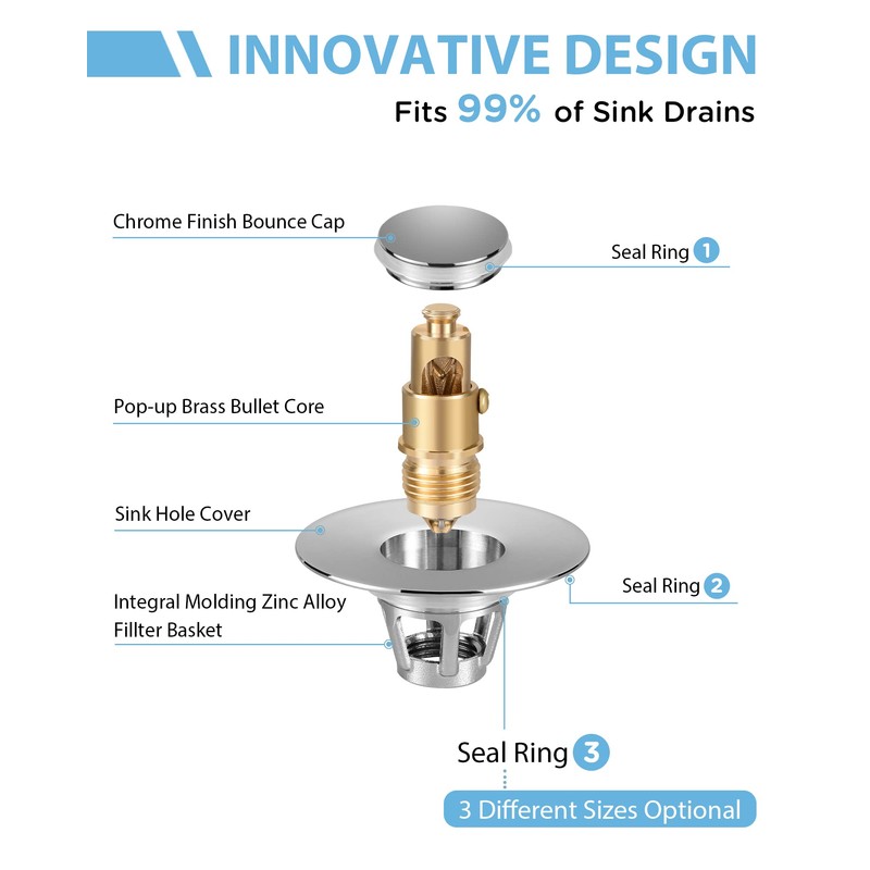 - 【PREMIUM QUALITY】Pop-up cap and anti-clogging frame made of integral molding brass with shiny chrome finish, bullet core made of premium brass, equipped with 3 silicon seal-rings in 3 different positions. It's anti-rust, reliable, and durable. You can trust it.