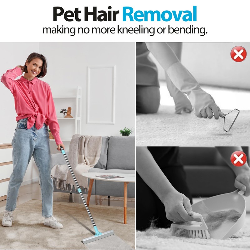 - Making no more kneeling or bending: The handle of the cat hair carpet rake is adjustable in length, ranging from 20 to 54 inches. It can be easily adjusted in length to save you from kneeling or bending when you are cleaning the pet hair. It must be a great carpet brush for pet hair. If you need to remove pet hair from your clothes, the metal Y - shaped fur remover can be helpful for you. Thanks to the hanging design, it also helps to save your space.