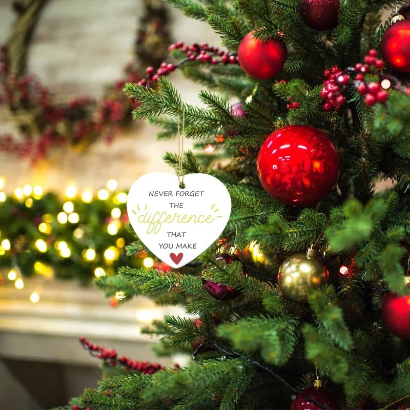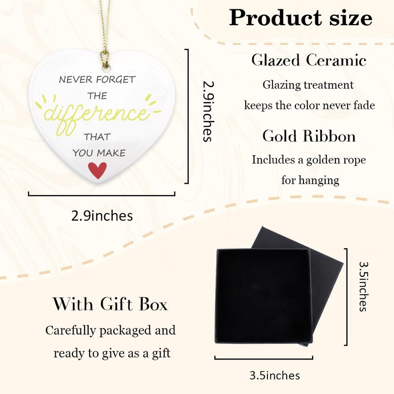 - 【Thank You Gifts for Women】 "Never forget the difference you make". This elegant ceramic heart-shaped ornament sign plaque keepsake is uniquely designed with inspiring message printed on both sides, makes it a special way to say thanks to someone who really made a difference in your life. Comes in a gift box, suitable for you to use it as a best thank you gift, thank you teacher gifts, thank you gifts for teachers, thank you gifts for coworkers, thank you gifts for men, teacher thank you gifts.