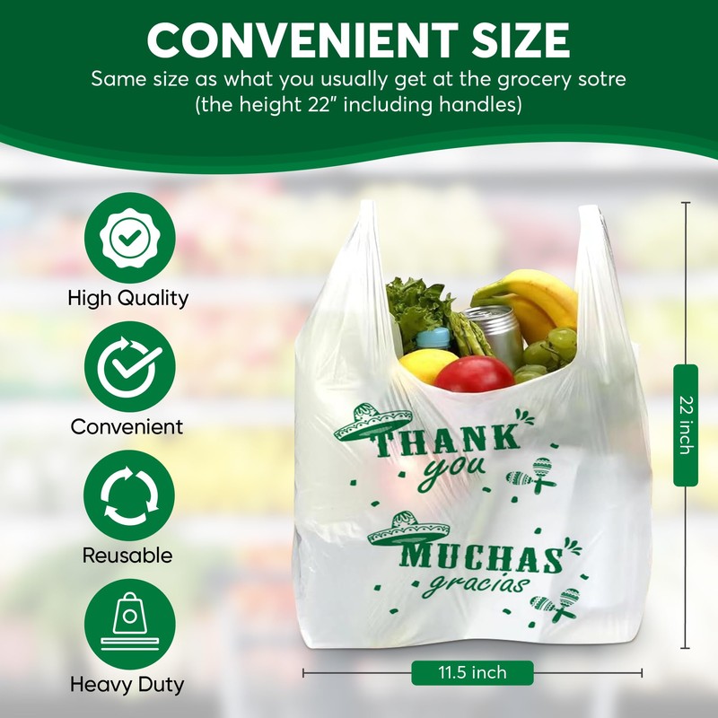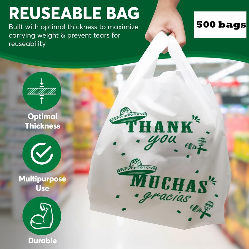 Thank You Muchas Gracias Print, Plastic Shopping Bags with handles, 500 Count, White, 11.5" x 7.5" x 22