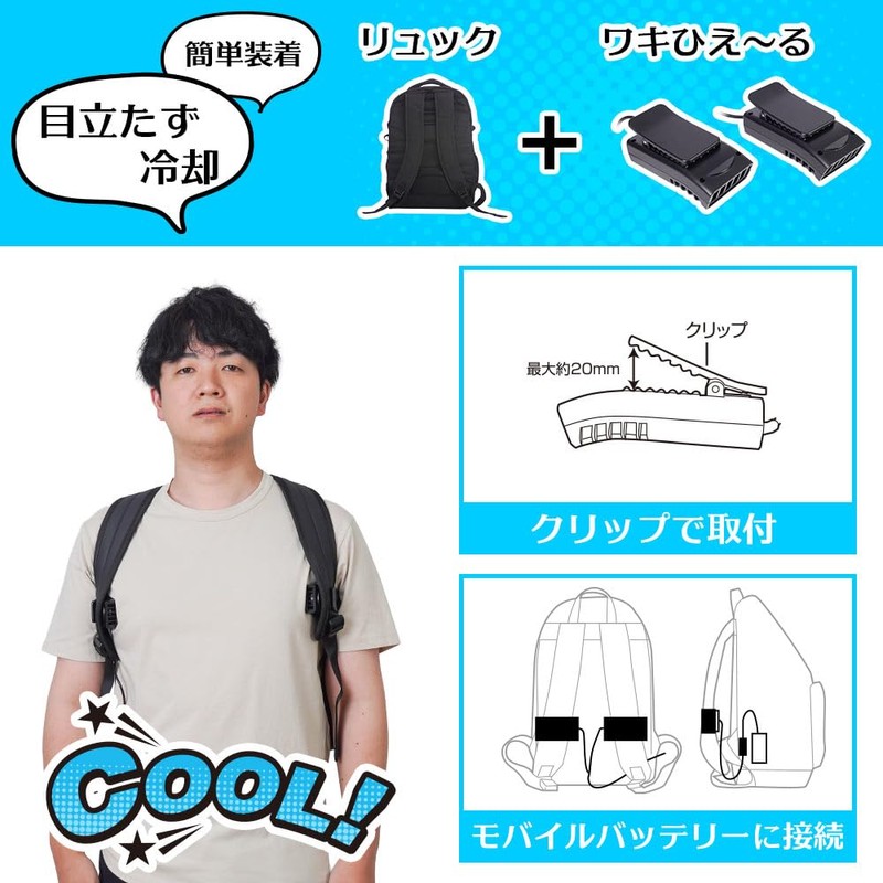 • (Inconspicuous Cooling Underarms) The Wakihire-Ru cooling device that attaches to your backpack and cools your underarms by attaching it to your backpack's shoulder belt. Chilling underarms efficiently cools the whole body, but the ice packs don't stay cool and can be hard to attach to your body. The "Waki Haikuru" is a clip that makes it close to your body by carrying it on your back. Connects to a power bank to keep you cool. Cooling your underarms to keep you cool even in intense heat. A new cooling device that is different from a neck cooler or fan
