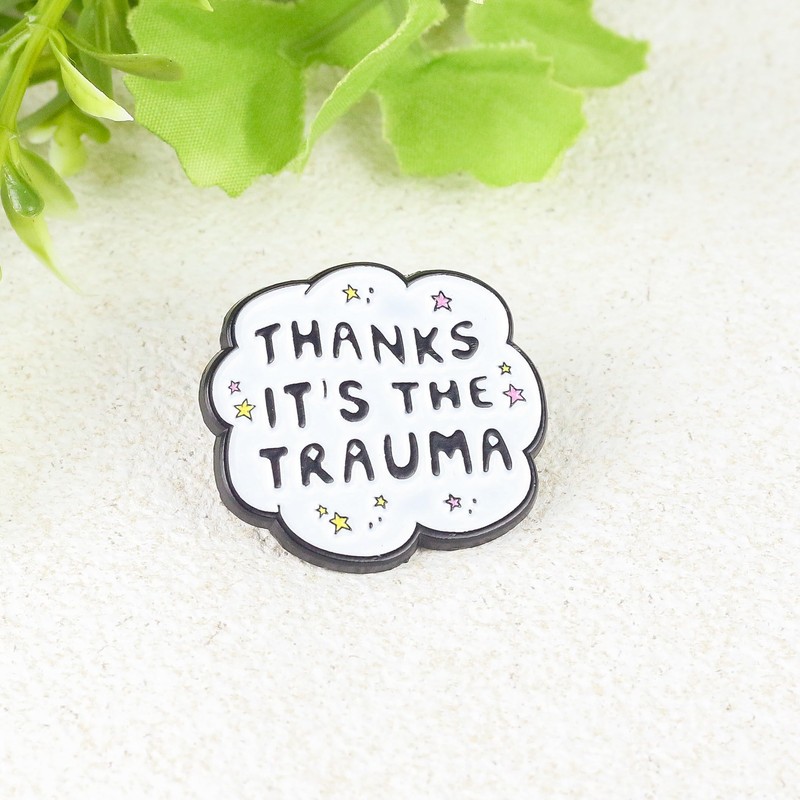 - CUTE DESIGN: White cloud-shaped enamel pin with black lettering and decorative yellow and pink stars, featuring a humorous message about trauma