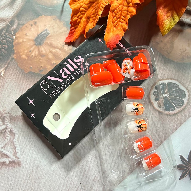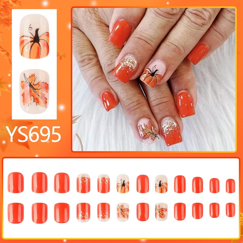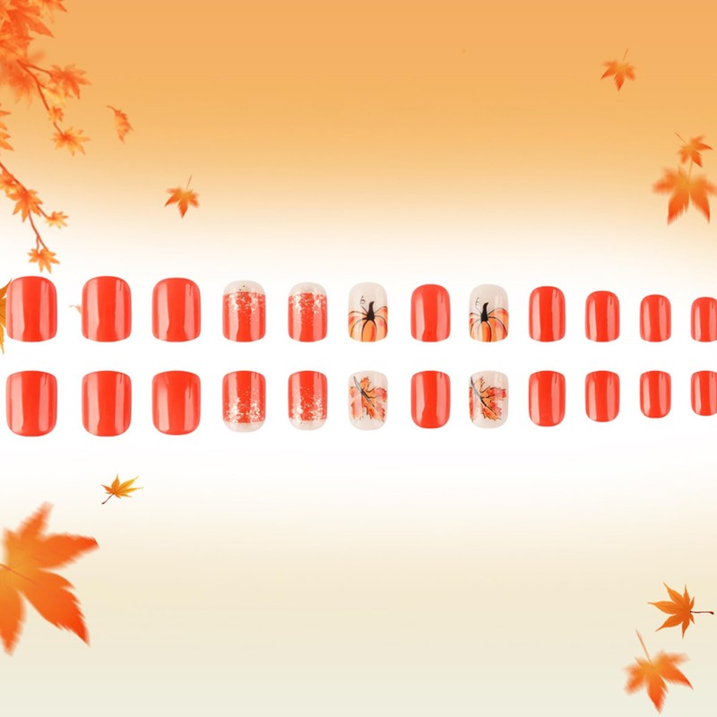 Thanksgiving Day Press on Nails Medium Square Artificial Acrylic Nail Pumpkin...