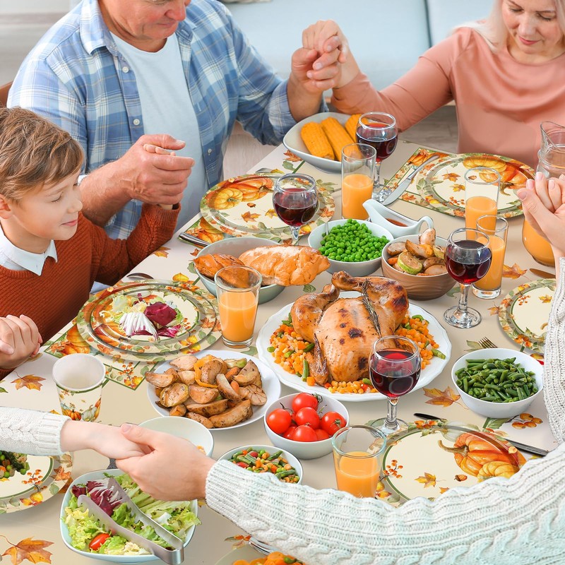 - [THANKSGIVING THEMED PARTY TABLEWARE]: Includes 1pcs x 108*54in tablecloth, 24pcs x 9in harvest dinner plates, 24pcs x 7in autumn wreath dessert plates, 24pcs x napkins,24pcs x cups. Enough for fall thanksgiving party dining and decoratingThese thoughtfully crafted Thanksgiving plates and napkins are ideal for gatherings of up to 24 guests. Choose our Thanksgiving tableware, let your Thanksgiving theme party full of colors and fun