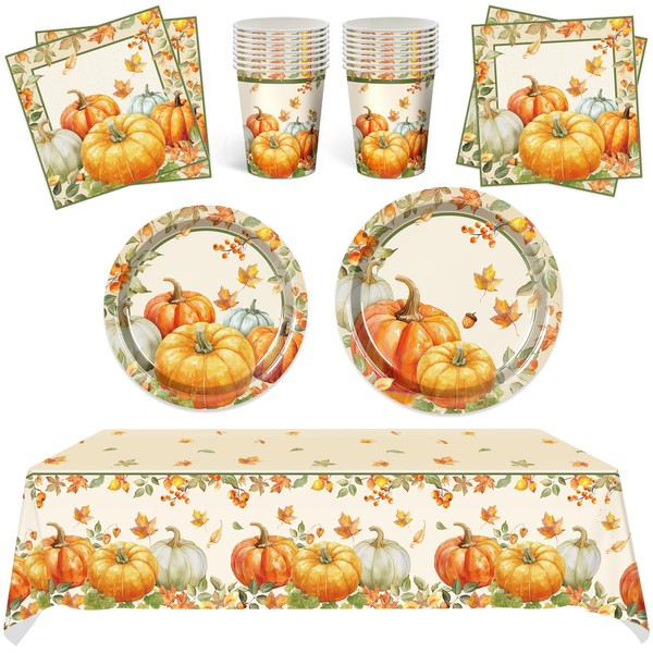 Thanksgiving Plates and Napkins,Fall Watercolor Pumpkin Maple Leaves Paper Plates, Cups Tablecloth,for Thanksgiving Dinner, Friendsgiving, and Autumn Party,Serves 24