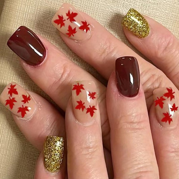Thanksgiving Press on Nails Square Short Length Glossy Full Cover Acrylic Square False Nails with Maple Leaf Designs Artificial Autumn Leaves Fake Nails Holiday Glue ons Fingernails for Women(C605)