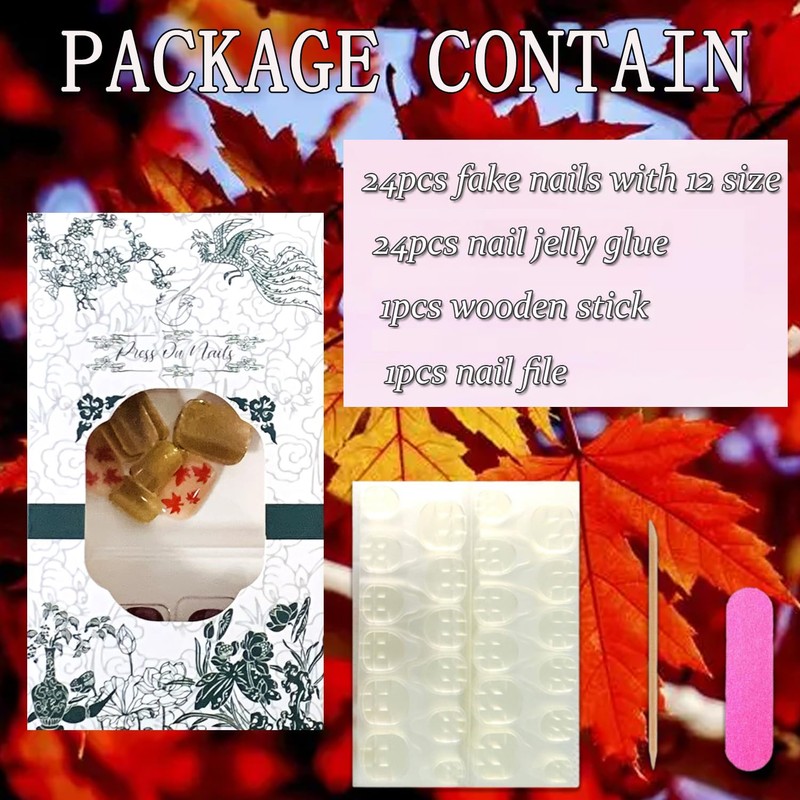 - 【Includes Tool Kit】You'll get 24 fall leaf false nails in 12 sizes. 1 mini nail file, 1 small wooden stick, 1 piece of nail glue sticker and 1 piece cleaning paper. Thanksgiving glue on nails are perfect for most people's nails.
