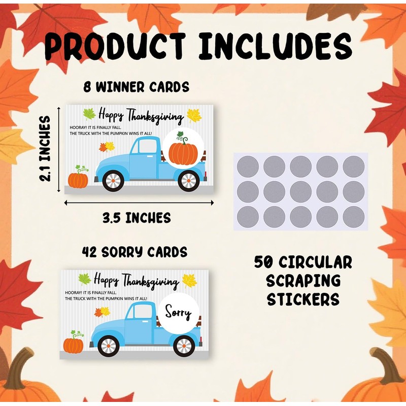 - Size and packaging: This Thanksgiving scratch card is 2.1x3.5 inches in size, which is easy to carry. It is just right whether you hold it in your hand or put it in a holiday greeting card. Each set contains 42 winning cards, 8 losing cards and 50 scratch cards, which are easy to carry and enhance the sense of ceremony.