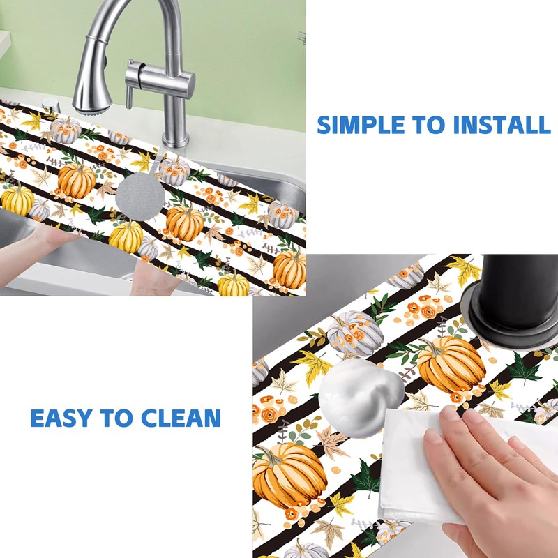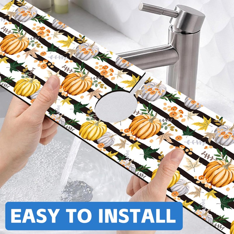 Thanksgiving Sink Faucet Absorbing Mat Autumn Pumpkin Floral Absorbent Fast Drying Mat Faucet Draining Mat Sink Splash Guard Behind Faucet Drip Catcher for Kitchen Bathroom 5.5"×24"