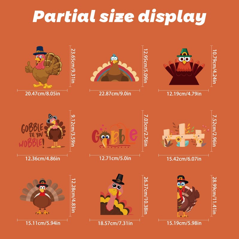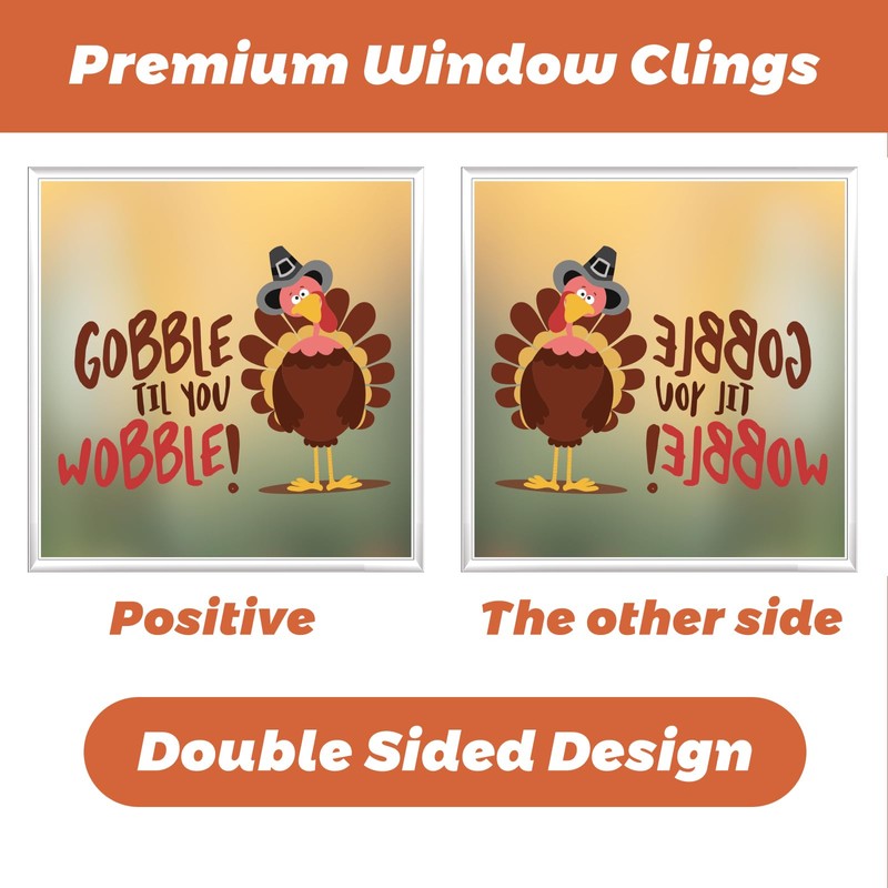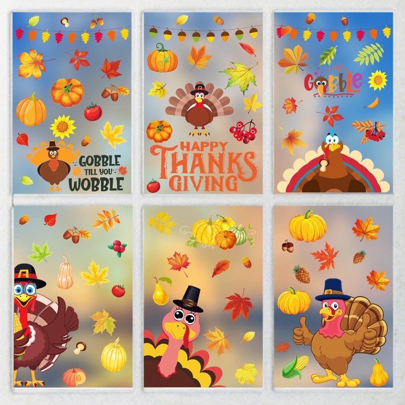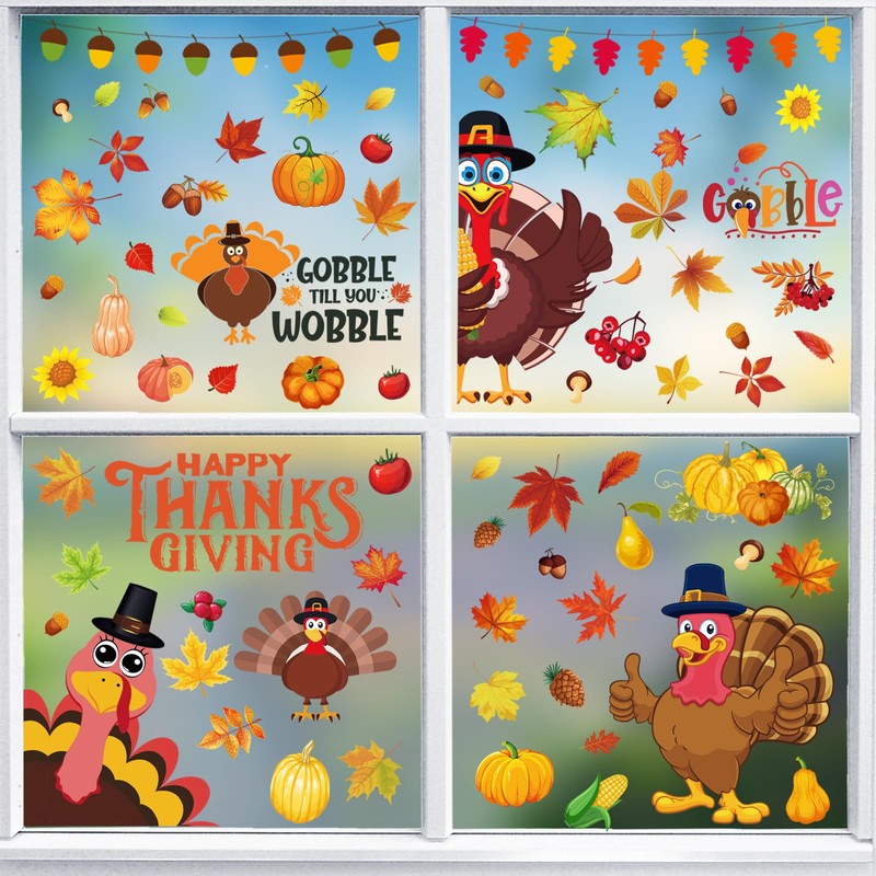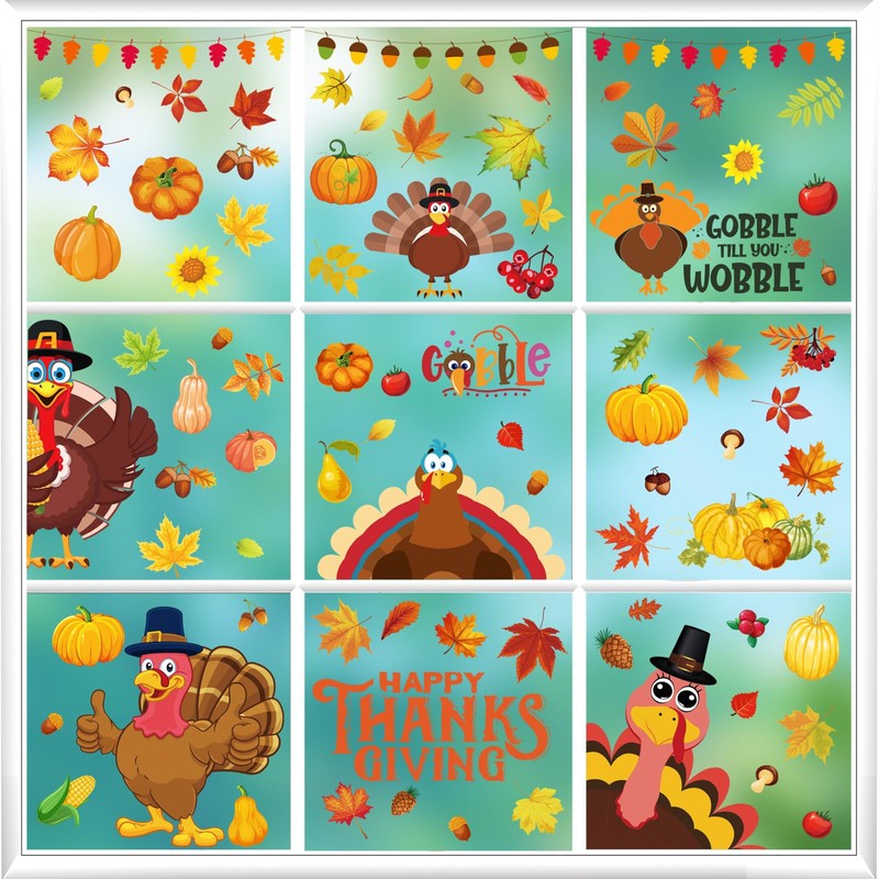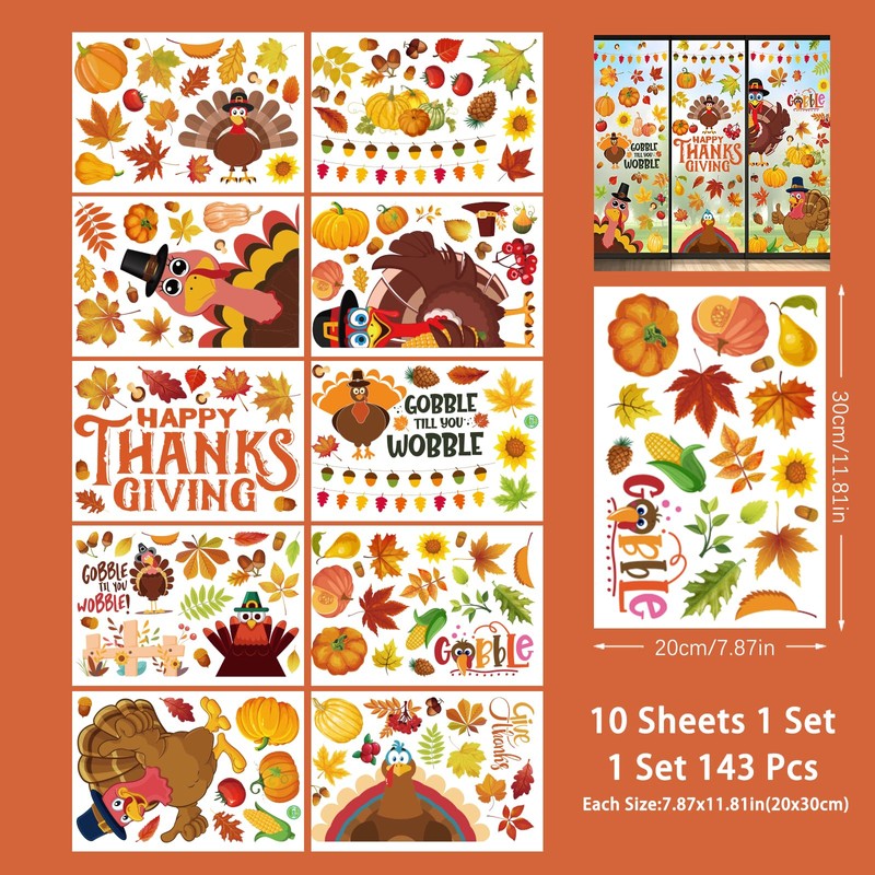 • COMPLETE SET: 143 pieces of Thanksgiving-themed window clings across 10 double-sided sheets, featuring turkeys, pumpkins, autumn leaves, and festive text designs