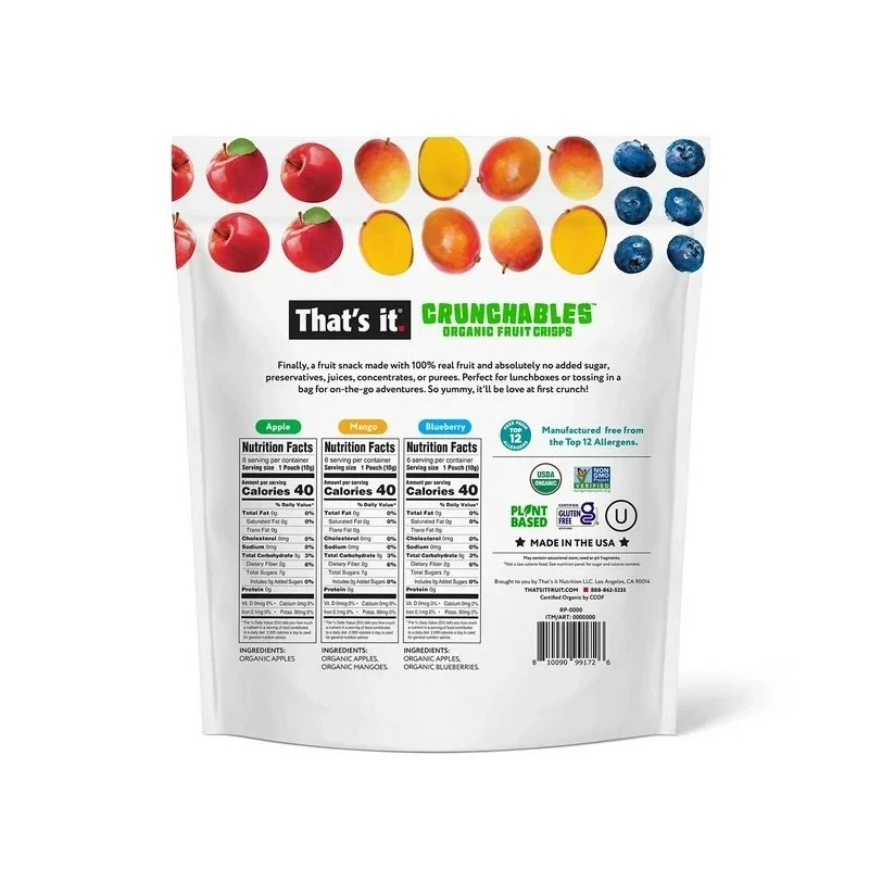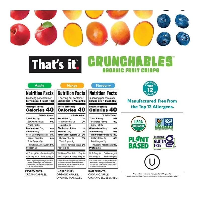 Say hello to a delicious, healthy snack the whole family will love. That’s It Crunchables are made with 100% organic fruit—no added sugar, preservatives, juices, purees, or concentrates. Just clean, crisped whole fruit. That's it.