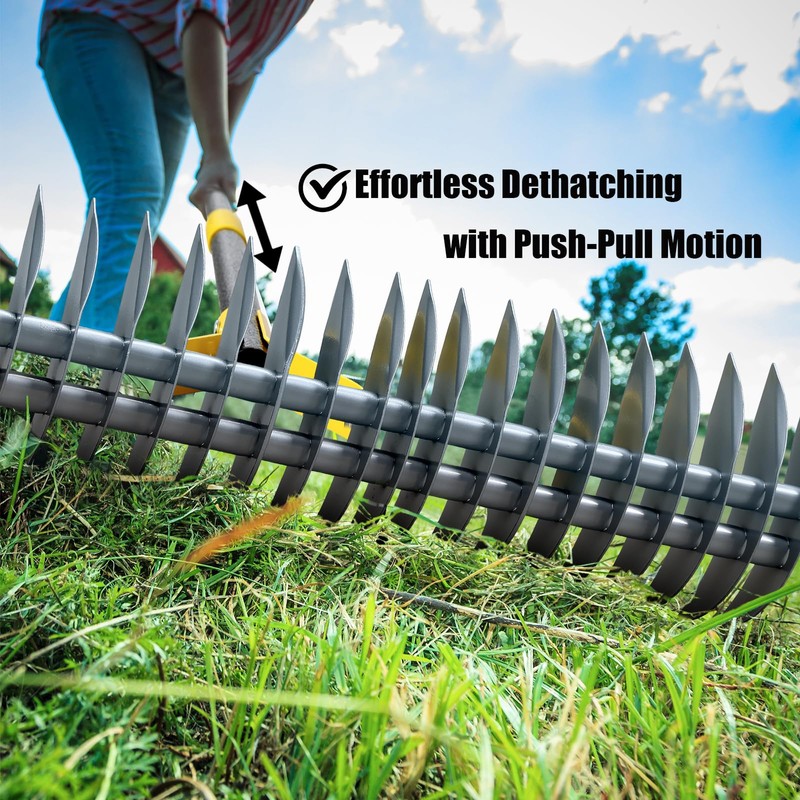 - Easy to Use &store: Just rake back and forth to quickly lift thick layers of thatch—No tricky setup or special skills needed.And when you're done, simply hang it by the built-in hole to save floor space and keep neat