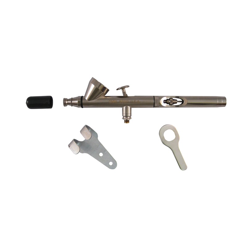 The Omni series was designed for tight detail to broad spraying using a “One Tip-One Needle” combination. The Omni series is a dual action internal mix airbrush. When trying for that one last detail, just the right blend or a great smooth finish Omni detail guns are ideal. Omni airbrushes work equally well at low or high pressures for varying applications. Besides performing well with finely ground colors, Omni airbrushes can handle heavier automotive paint with no need to change tips/needles. Designed with state-of-the-art engineering, Omni air-brushes are manufactured to the tightest possible tolerances. Omni airbrushes feature heavy nickel chrome plating, superior balance, solvent resistant o-rings and numerous other performance enhancements. Omni airbrushes are known worldwide as the performance and price preference to other similarly designed airbrushes. The reversible air cap guard is unique and exclusive to Omni airbrushes– reversing the air cap guard creates a smooth, aerodynamically rounded area at the tip/needle intersection enabling optimum airflow efficiency for the sharpest and finest lines. The “reverse-a-guard” air cap allows for easy removal of tip dry. It can also be utilized to protect the needle tip for novice air brushers or in more delicate airbrush applications. The Model T88 Set contains Omni5000 gravity feed airbrush with 1/8 ounce mounted color cup, wrench, protective cap, and instruction manual. Proudly made in the USA.