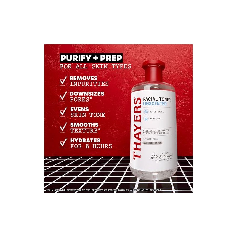 Elevate your skincare routine with Thayers Alcohol-Free Witch Hazel Toner, your one step prep for better-looking bare skin. Our clinically tested formula visibly reduces the appearance of pores, provides all day hydration and smooths skin texture. Leveraging the potent power of medicinal plants and derm actives, our pure-grade alcohol-free witch hazel and aloe vera soothes and balances while glycerin immediately hydrates and draws moisture to the skin. With nourishing natural ingredients, our toners can be used in countless ways. Tired of razor burn? Soothe irritation with Thayers. Prepping for a full face of glam? Our toner has you prepped. Do your nails need a refresh? Thayers cleanses nails before a mani. Dealing with sunburns, bug bites or fresh ink? This formula calms discomfort naturally. Thayers is backed by science to level up your skincare.
