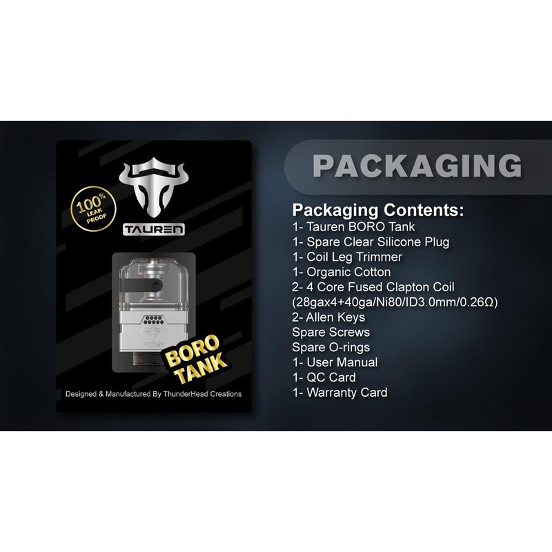 - Set Contents: 1 x Tauren Boro Tank Atomizer 1 x Coil Cutting Tool 1 x Spare Silicone Plug 1 x Organic Cotton 2 x Fused Clapton Coils (28ga*4+40ga/Ni80/ID3.0mm/0.26ohm) 2 x Allen Keys 1 x Spare Screws 1 x Spare O-rings 1 x User Manual 1 x QC Card 1 x Warranty Card 1 x Warranty Card 1 x ihen vape Band
