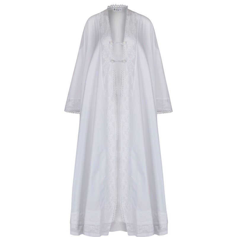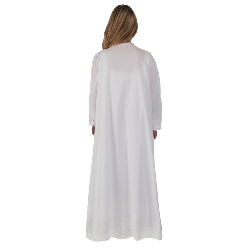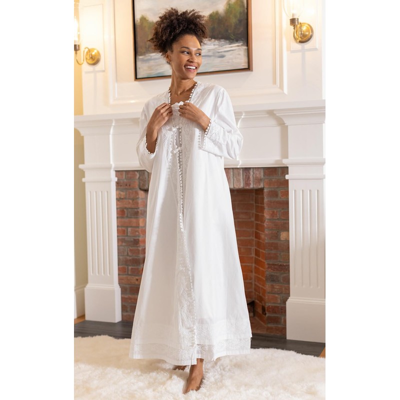 - 100% Cotton long sleeve housecoat - The Rosalind is the perfect all season layer with a full length, an open front, a two-frog closure at the bust, side-seam pockets, scallop edged trim, and delicate embroidery detailing. Wonderfully elegant yet perfectly cozy, this women's housecoat perfectly mixes style and comfort.