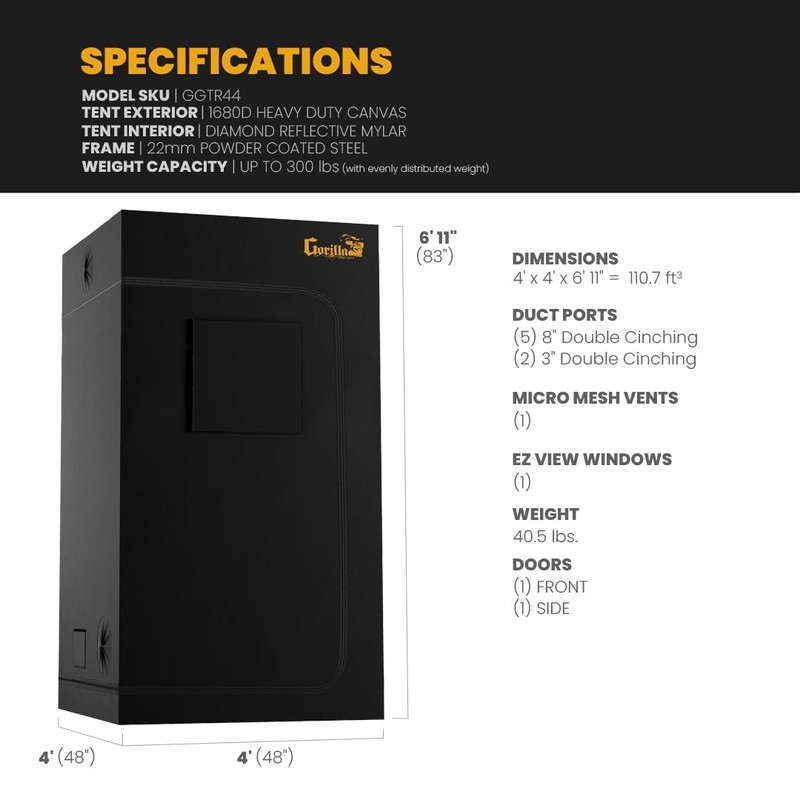The All New Gorilla Grow Tent 4X4X6'11" - Tallest, Thickest, Strongest - Unmatched Durability in Hydroponic Indoor Grow Tents, 300lbs Hang Weight Capacity, Industrial Fabric, Reflective Interior