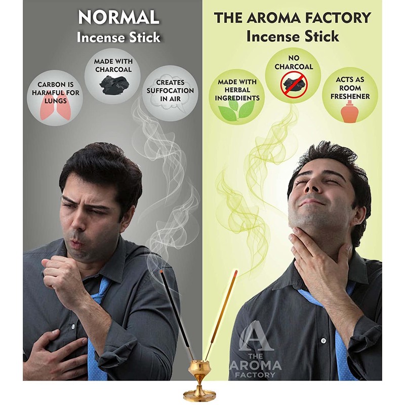 - The Aroma Factory: 100% Herbal Sticks. Made with 0% Charcoal, freshens the air and neutralises unwanted odour.Low Smoke & Long Sticks - 9 inches, made with Aromatic Essential Oils for Soothing Fragrance.